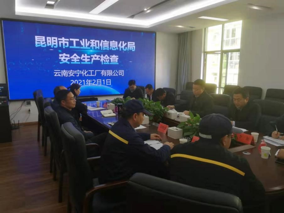 2021年2月1日上午,昆明市工業和信息化局局長趙小平一行到公司開展歲末年初安全生產檢查,安寧市副市長張紀輝和安寧市工信局相關人員陪同檢查。