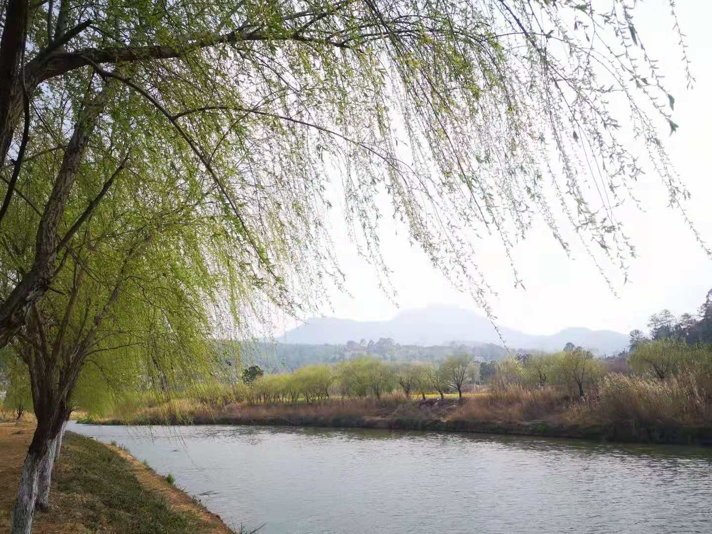 春風吹過,只幾天的功夫桃花、杏花、李花都開了,樹也醒了,就見枝頭萌出片片新綠,粉粉嫩嫩的春色里,唯“拂堤煙柳”最具春的嫵媚,萬千絲絳映著陽光,隨風搖曳,裊娜多姿!穿行其間,眼睛和心都柔軟了…